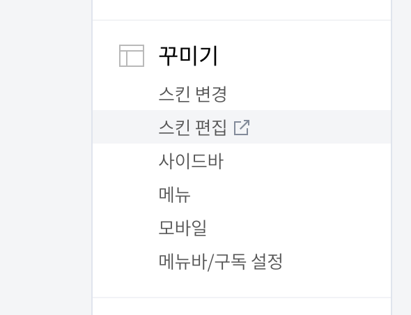 티스토리 설정에 들어가셔서 좌측에 꾸미기 탭에 스킨 편집을 클릭해 줍니다.