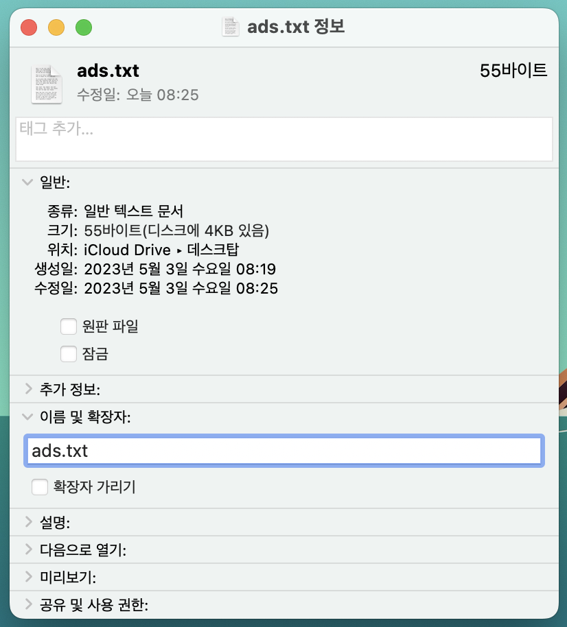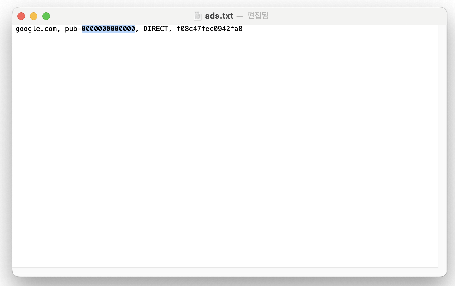 "ads.txt" 파일명으로 텍스트 파일을 생성해 줍니다. txt는 확장자임으로 유의해주시기 바랍니다. 또 저는 Mac OS에서 진행한 내용을 공유드리겠습니다. 본인의 ads정보를 불러와줍니다. 아래와 같이 내용이 복사될 것입니다. pub- 뒤의 번호가 본인의 고유 번호이며 이 번호는 구글 애드센스 홈페이지 왼쪽계, 계정 -> 설정 -> 계정 정보 탭에서 게시자 ID와 동일함을 확인합니다. 아래의 하이라이트 처리된 00000... 번호로 되어있는 부분이 고유의 아이디로 확인되실 겁니다. 개인정보보호를 위해 00000으로 표시한 점 이해부탁드립니다.